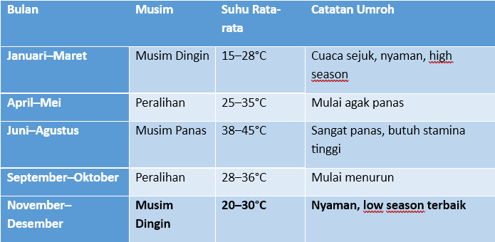 Suhu rata-rata di Makkah pada bulan November berkisar 20–30°C, jauh lebih nyaman dibanding musim panas (Juni–Agustus) yang bisa mencapai 45°C.