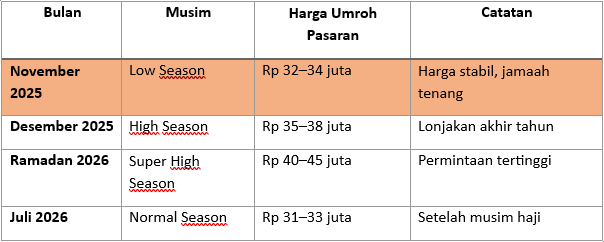 Bulan November 2025 menjadi salah satu waktu terbaik bagi jamaah dari Jawa Timur, termasuk wilayah Bondowoso dan Malang, untuk melaksanakan ibadah umroh. Cuaca di Tanah Suci sedang sejuk, jamaah belum terlalu padat, dan harga paket masih tergolong wajar sebelum musim naik di akhir tahun.
