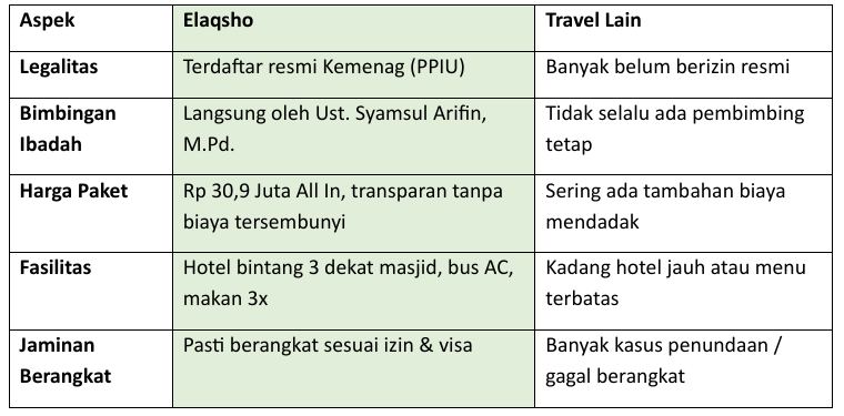 4️⃣ Apa keunggulan Elaqsho dibanding travel lain? Legalitas resmi, pelayanan profesional, harga transparan, dan jaminan pasti berangkat.